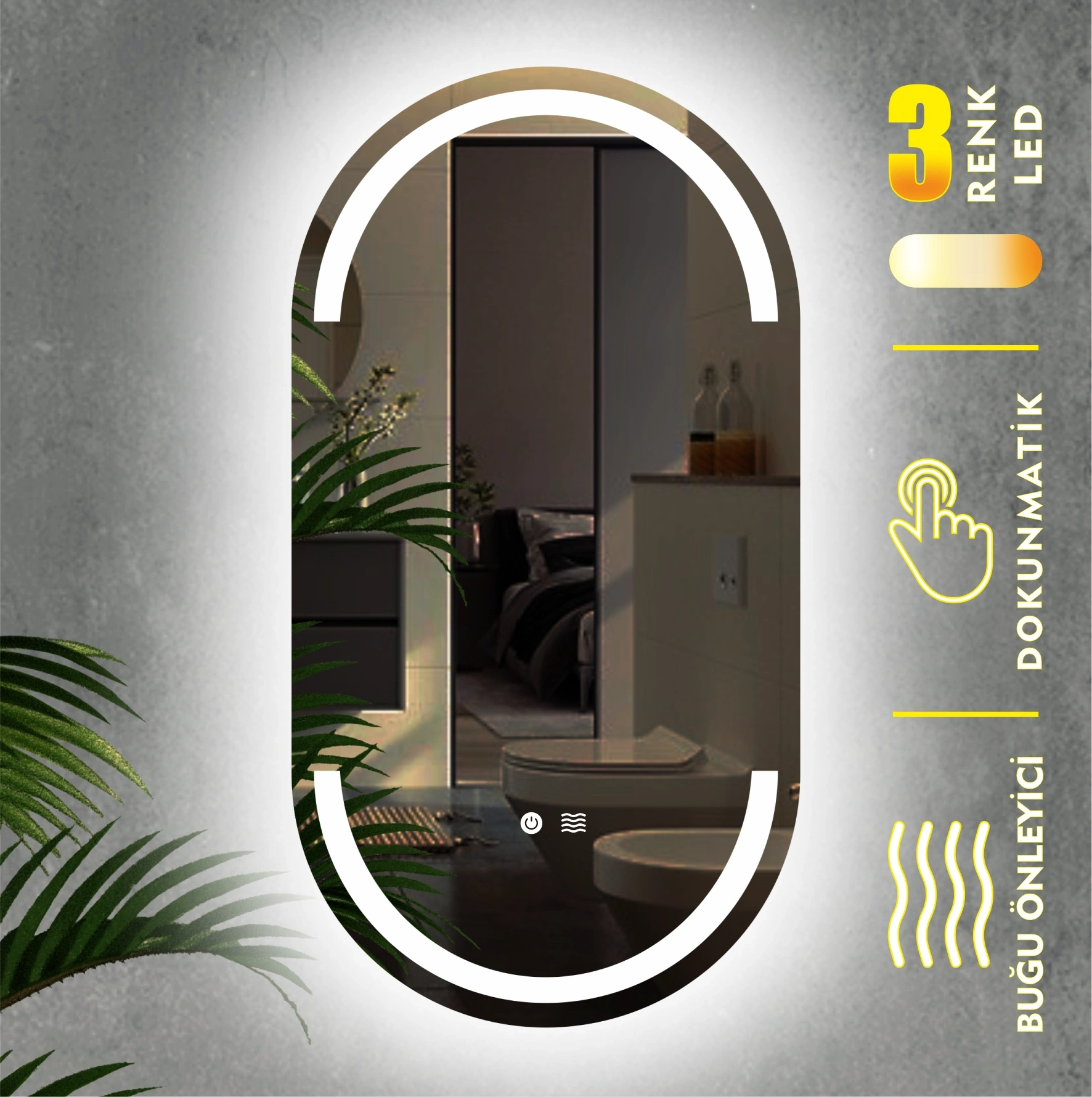 Model - 4 ; Dokunmatik aç kapa kontrol vardır.Üç renk ışık yanmaktadır. (Amber, Beyaz ve Gün Işığı). Dokunmatik butonuna kısa dokunuşlar ile renk değiştirilir. Dokunmatik butonuna basılı tutularak ışık gücü ayarlanabilir. Buğu Önleyici Rezistans bulunmaktadır.Tek dokunuşla Buğu Önleyici aktif edilir. Banyo içerisinde oluşan buğu kısa süre içerisinde çözülür ve net bir görüntü elde edilir.