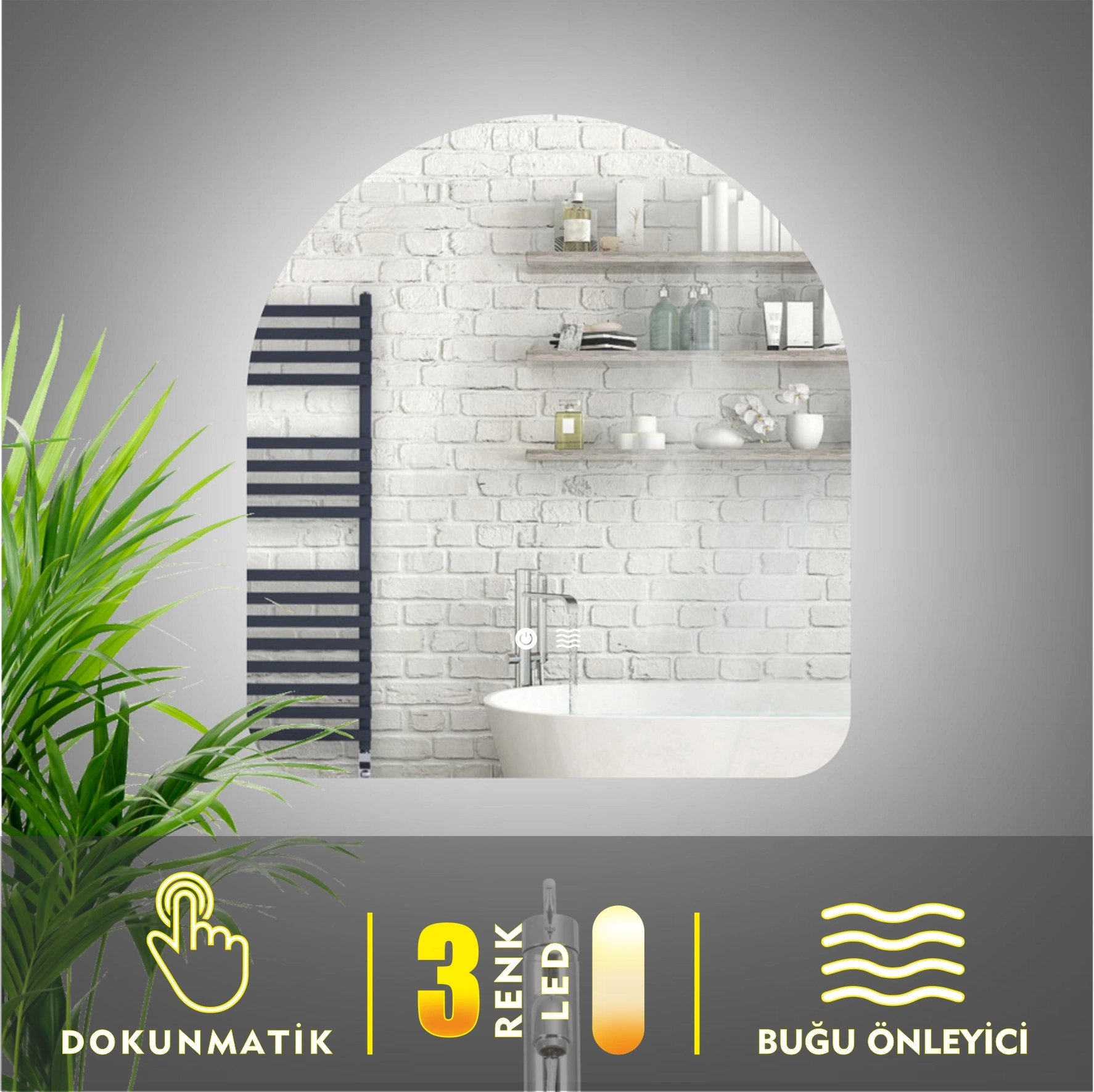 Model - 4 ; Dokunmatik aç kapa kontrol vardır.Üç renk ışık yanmaktadır. (Amber, Beyaz ve Gün Işığı). Dokunmatik butonuna kısa dokunuşlar ile renk değiştirilir. Dokunmatik butonuna basılı tutularak ışık gücü ayarlanabilir. Buğu Önleyici Rezistans bulunmaktadır.Tek dokunuşla Buğu Önleyici aktif edilir. Banyo içerisinde oluşan buğu kısa süre içerisinde çözülür ve net bir görüntü elde edilir.