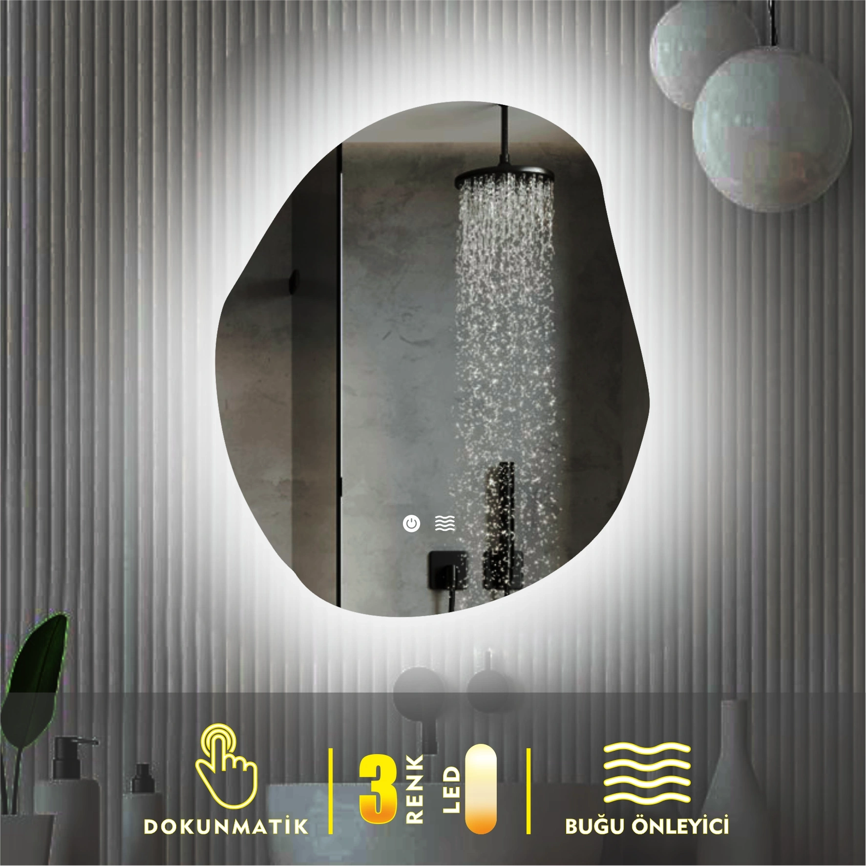 Model - 4 ; Dokunmatik aç kapa kontrol vardır.Üç renk ışık yanmaktadır. (Amber, Beyaz ve Gün Işığı). Dokunmatik butonuna kısa dokunuşlar ile renk değiştirilir. Dokunmatik butonuna basılı tutularak ışık gücü ayarlanabilir. Buğu Önleyici Rezistans bulunmaktadır.Tek dokunuşla Buğu Önleyici aktif edilir. Banyo içerisinde oluşan buğu kısa süre içerisinde çözülür ve net bir görüntü elde edilir.